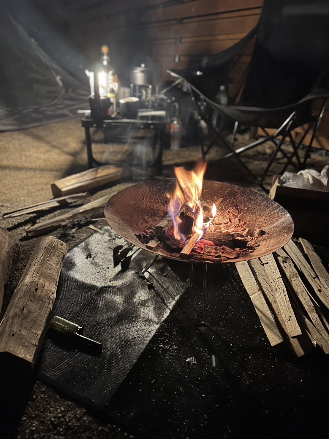 ランタンの灯りがやわらかくサイトを照らし、煙の向こうに見える炎がなんとも幻想的でした。