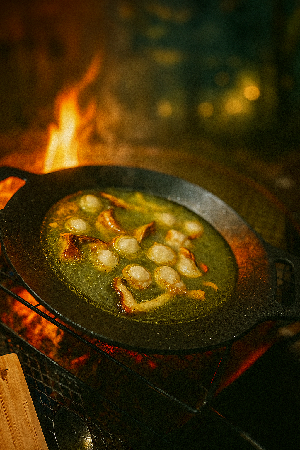 夜の帳(とばり)が降りる中、鉄板スキレットの中でホタテがコロっと転がり、キノコからは香りのエキスがじんわりと溶け出していきます。
